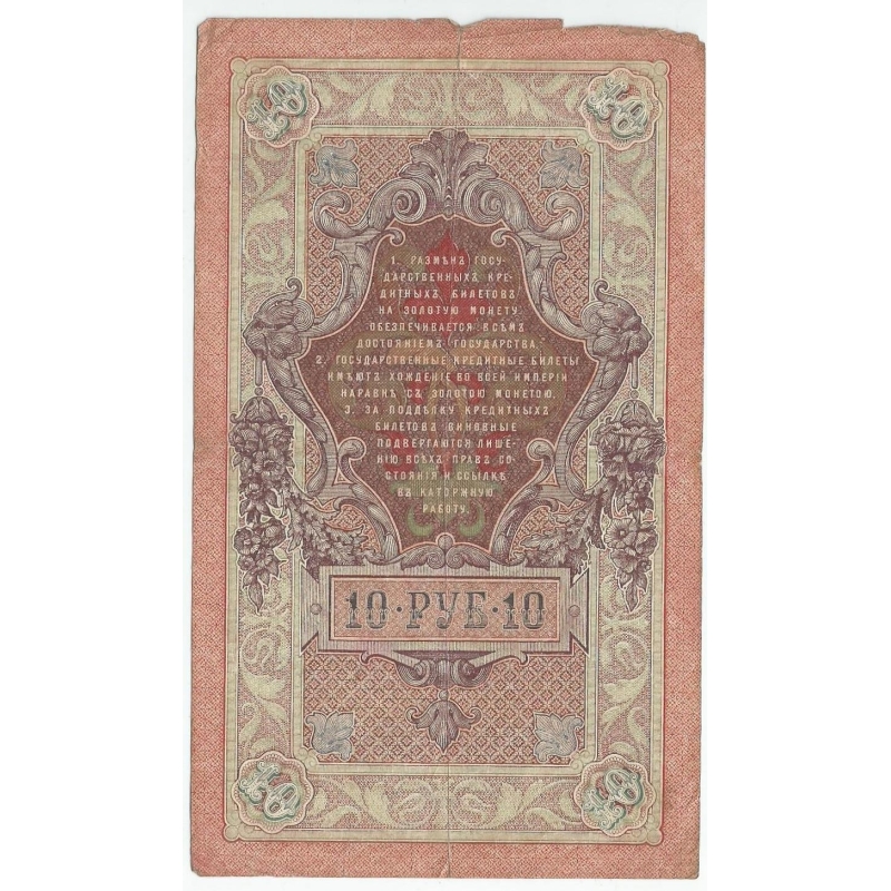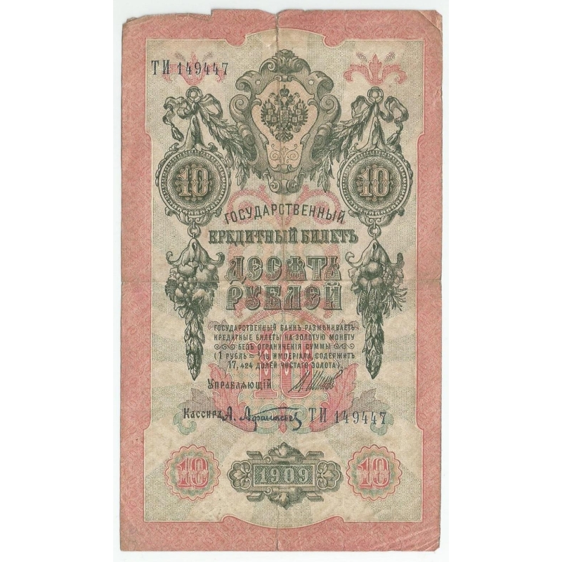 Oryginalny banknot Imperium Rosyjskiego o nominale 10 rubli z emisji 1909 roku.