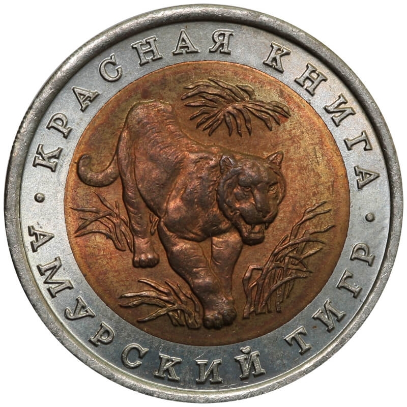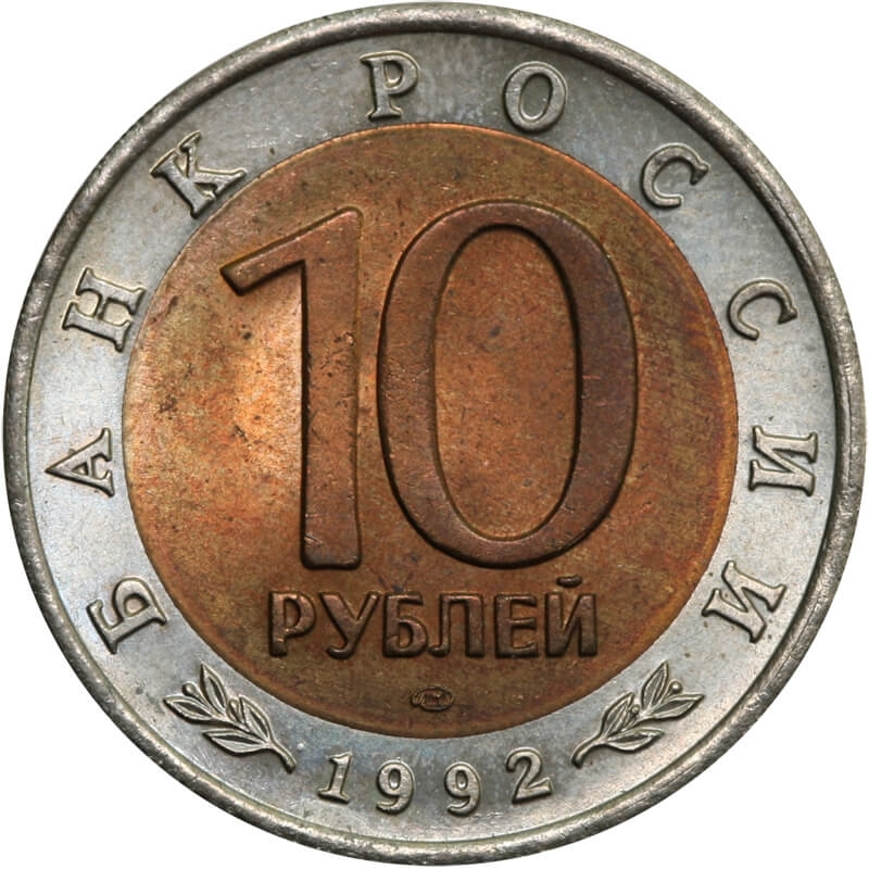 Bimetaliczna moneta o nominale 10 rubli z 1992 roku. Egzemplarz pochodzi z serii „Czerwona Księga” – cyklu poświęconego gatunkom zwierząt zagrożonych wyginięciem.