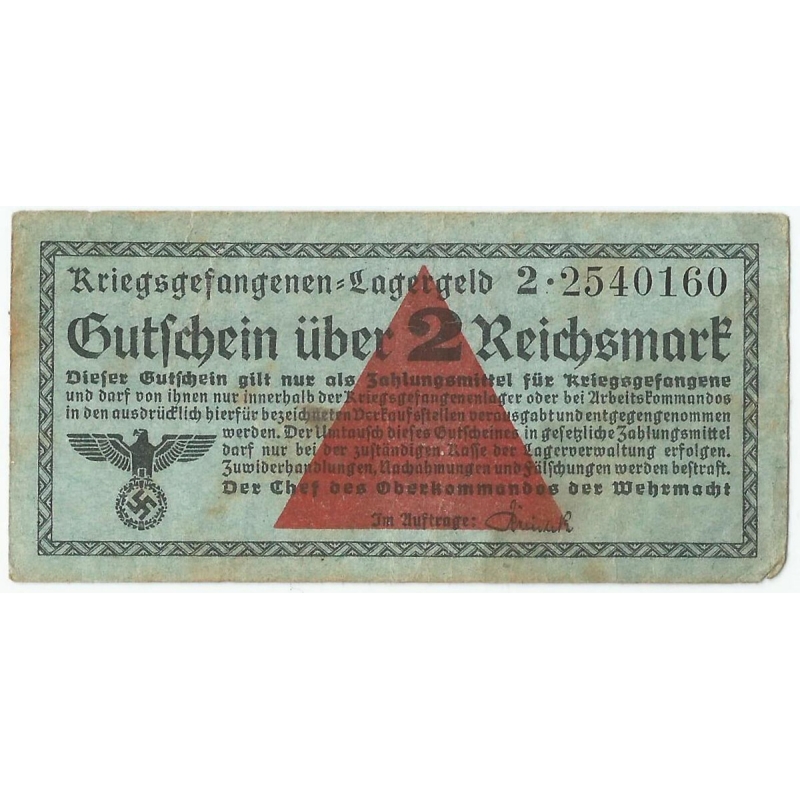 Oryginalny bon obozowy (Kriegsgefangenen-Lagergeld) o nominale 2 Reichsmark, emitowany przez Oberkommando der Wehrmacht w okresie II wojny światowej. Był środkiem płatniczym obowiązującym wyłącznie na terenie niemieckich obozów jenieckich (Stalags i Oflags) oraz w ich filiach roboczych.