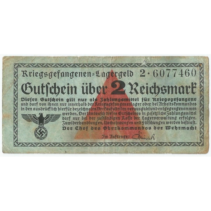 Oryginalny bon obozowy (Kriegsgefangenen-Lagergeld) o nominale 2 Reichsmark, emitowany przez Oberkommando der Wehrmacht w okresie II wojny światowej. Był środkiem płatniczym obowiązującym wyłącznie na terenie niemieckich obozów jenieckich (Stalags i Oflags) oraz w ich filiach roboczych.