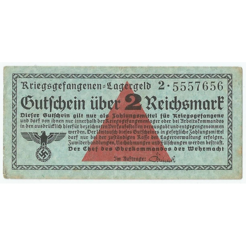 Oryginalny bon obozowy (Kriegsgefangenen-Lagergeld) o nominale 2 Reichsmark, emitowany przez Oberkommando der Wehrmacht w okresie II wojny światowej. Był środkiem płatniczym obowiązującym wyłącznie na terenie niemieckich obozów jenieckich (Stalags i Oflags) oraz w ich filiach roboczych.
