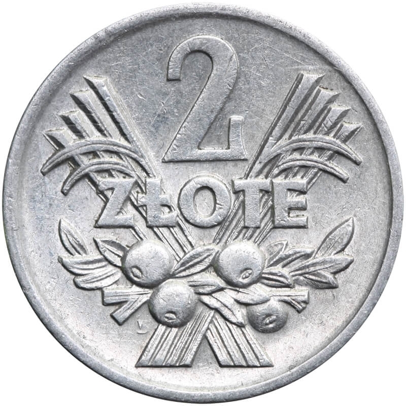 Awers: Nominał „2 ZŁOTE” na tle stylizowanych kłosów i gałązek – standardowy wzór monet obiegowych PRL.