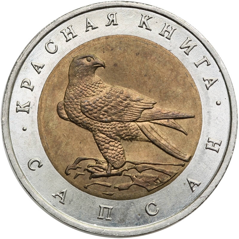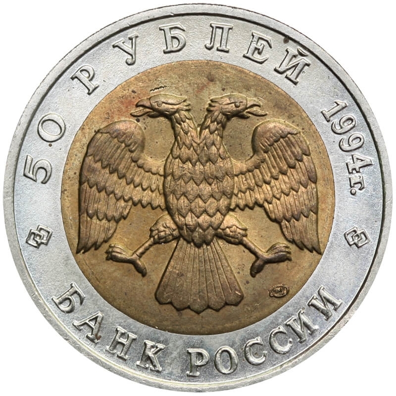 Bimetaliczna moneta o nominale 50 rubli z 1994 roku. Egzemplarz pochodzi z serii „Czerwona Księga” – cyklu poświęconego gatunkom zwierząt zagrożonych wyginięciem.