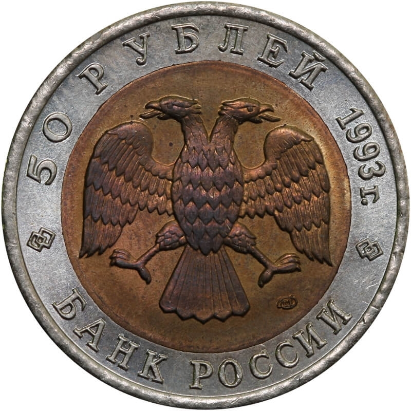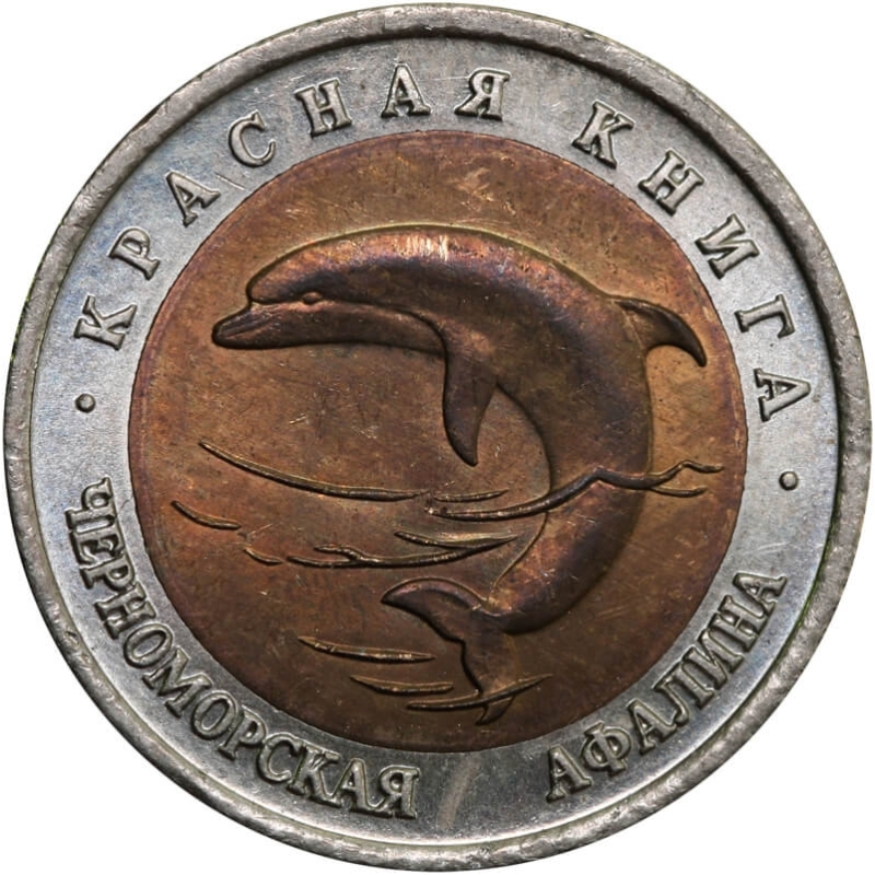 Bimetaliczna moneta o nominale 50 rubli z 1994 roku. Egzemplarz pochodzi z serii „Czerwona Księga” – cyklu poświęconego gatunkom zwierząt zagrożonych wyginięciem.