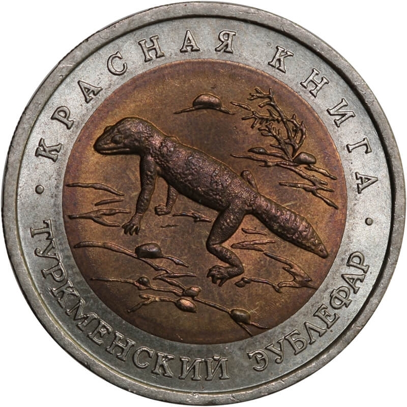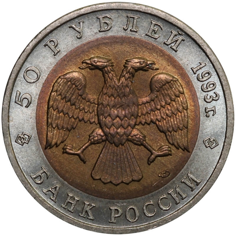 Bimetaliczna moneta o nominale 50 rubli z 1993 roku. Egzemplarz pochodzi z serii „Czerwona Księga” – cyklu poświęconego gatunkom zwierząt zagrożonych wyginięciem.