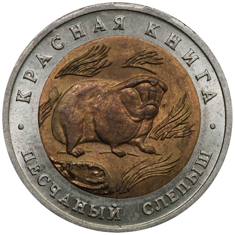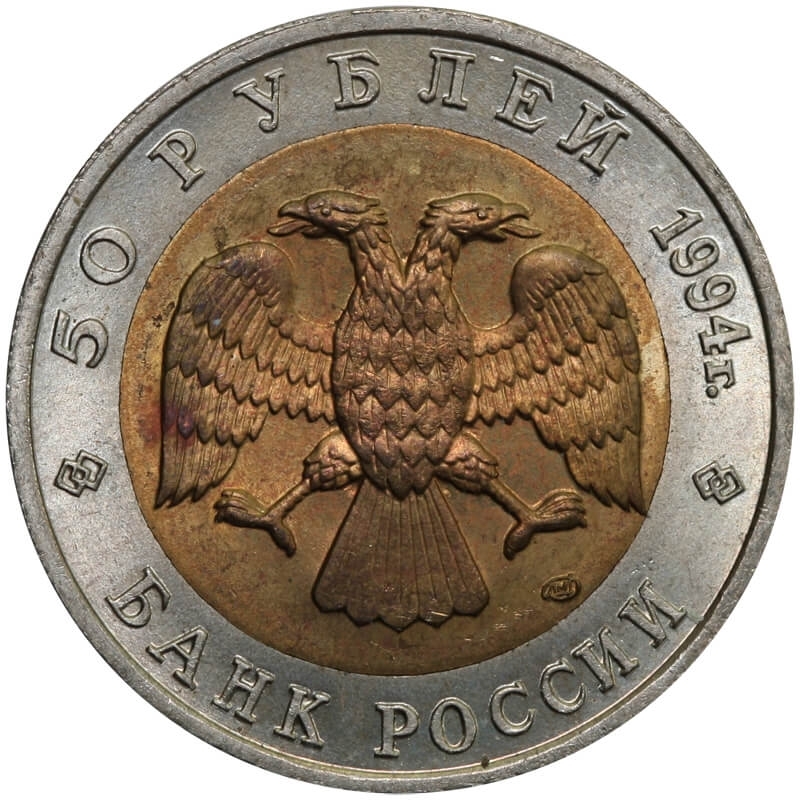 Bimetaliczna moneta o nominale 50 rubli z 1994 roku. Egzemplarz pochodzi z serii „Czerwona Księga” – cyklu poświęconego gatunkom zwierząt zagrożonych wyginięciem.
