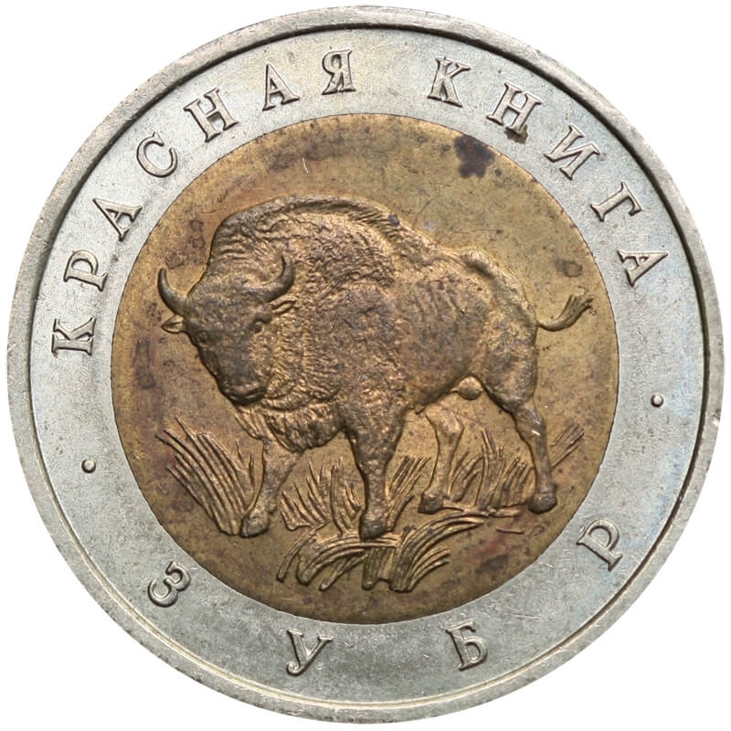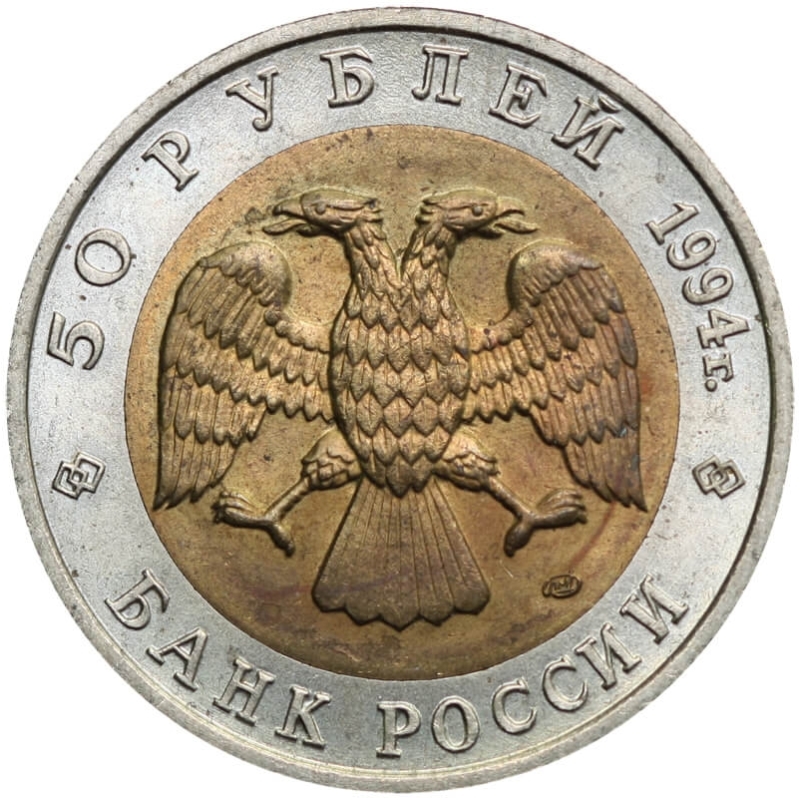 Bimetaliczna moneta o nominale 50 rubli z 1994 roku. Egzemplarz pochodzi z serii „Czerwona Księga” – cyklu poświęconego gatunkom zwierząt zagrożonych wyginięciem.