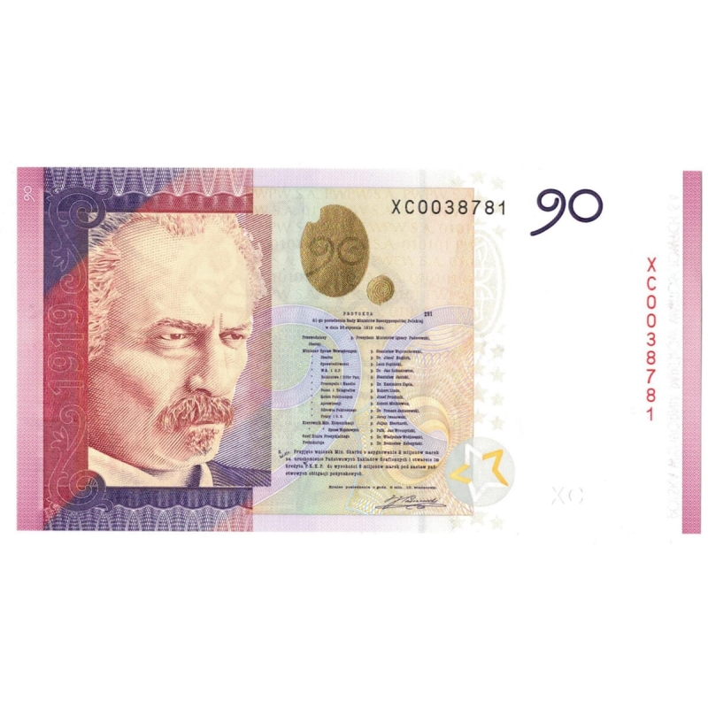Banknot Promocyjny Polskiej Wytwórni Papierów Wartościowych o nominale 90 z wizerunkiem Ignacego Paderewskiego.