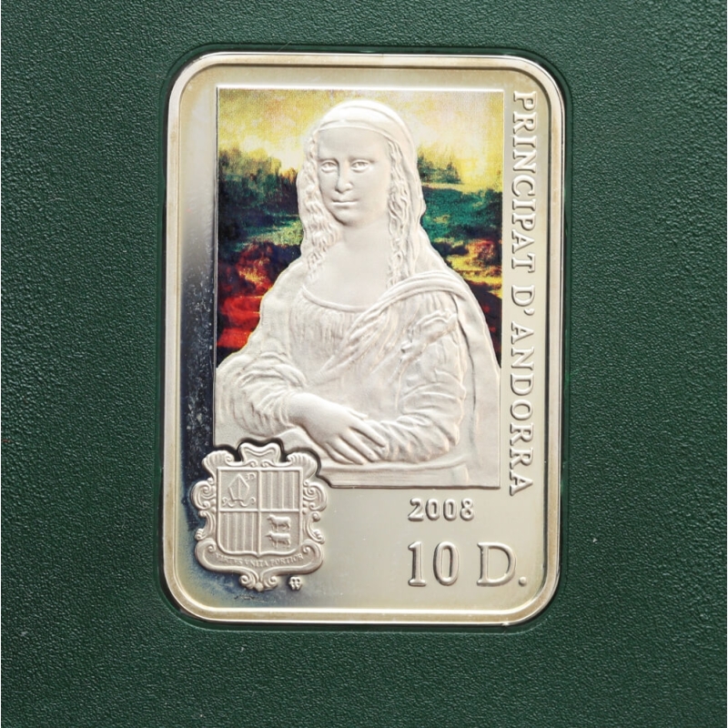 Rewers: stylizowany wizerunek Mony Lisy na tle pejzażu, herb Andory oraz napisy „Principat d’Andorra”, nominał 10 D. i rok emisji 2008.