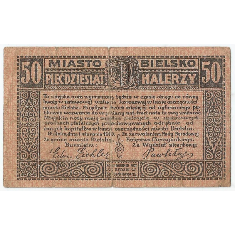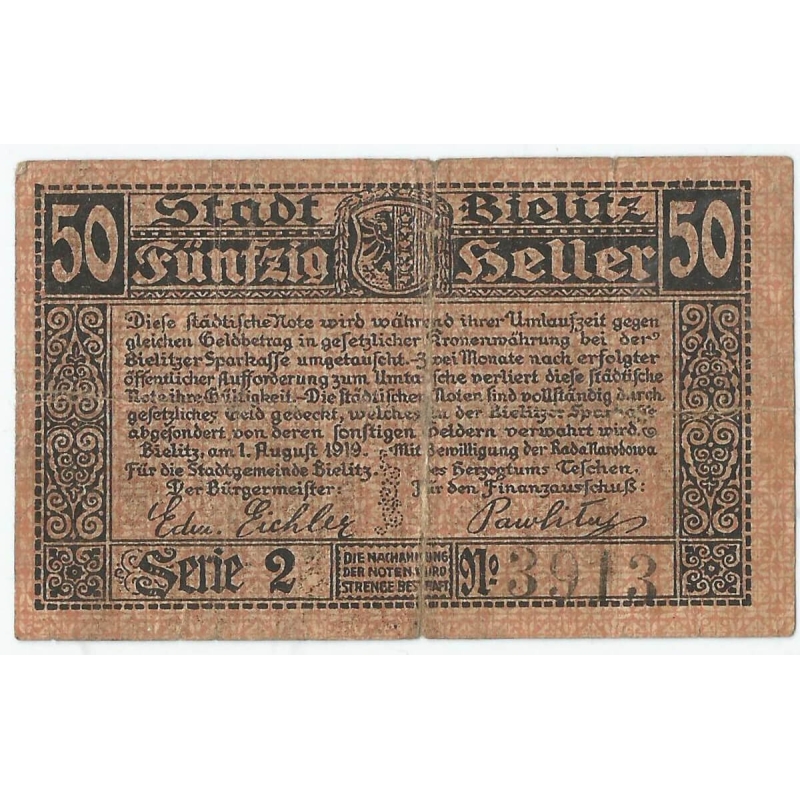 Miejska nota obiegowa o nominale 50 halerzy, wydana w Bielsku (Bielitz) 1 sierpnia 1919 r. Bon dwujęzyczny, z tekstem niemieckim i polskim, sygnowany przez burmistrza Eichlera i członka wydziału skarbowego Pawlitza. Typowa emisja kryzysowa zabezpieczona funduszami Kasy Oszczędności. Egzemplarz w stanie obiegowym, zgięcia i naturalne ślady użytkowania, papier w całości. Idealny jako uzupełnienie kolekcji notgeldów Śląska Cieszyńskiego.