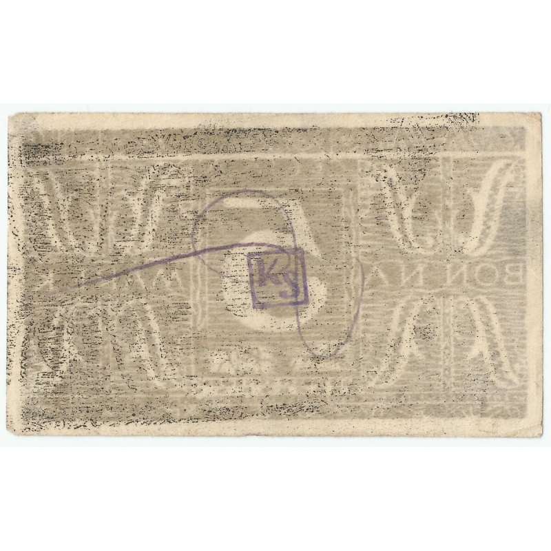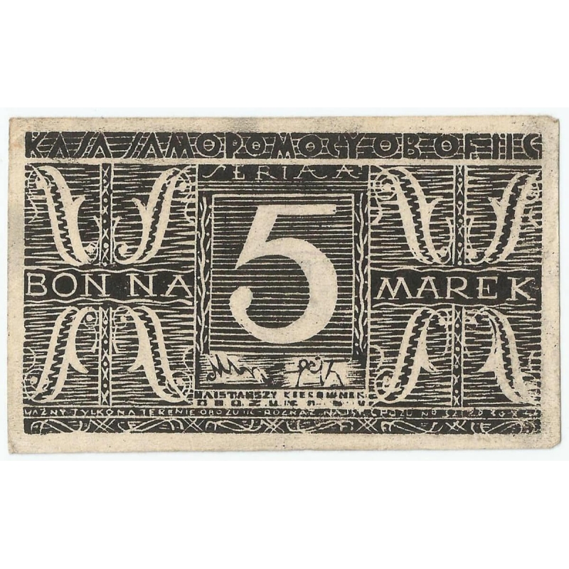 Bon obozowy o nominale 5 marek, emitowany w 1944 roku w obozie jenieckim Oflag II C Woldenberg, gdzie przetrzymywano polskich oficerów podczas II wojny światowej. Bony te pełniły funkcję środka płatniczego wewnątrz obozu, umożliwiając wymianę w kantynach i stanowiąc część zorganizowanego systemu życia jeńców.