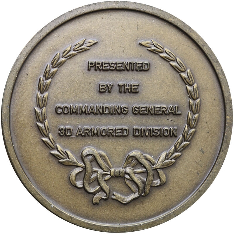 Centralnie umieszczony napis dedykacyjny w czterech wierszach: PRESENTED / BY THE / COMMANDING GENERAL / 3D ARMORED DIVISION. Całość otoczona klasycznym wieńcem laurowym, przewiązanym u dołu ozdobną kokardą, co podkreśla honorowy charakter odznaczenia.