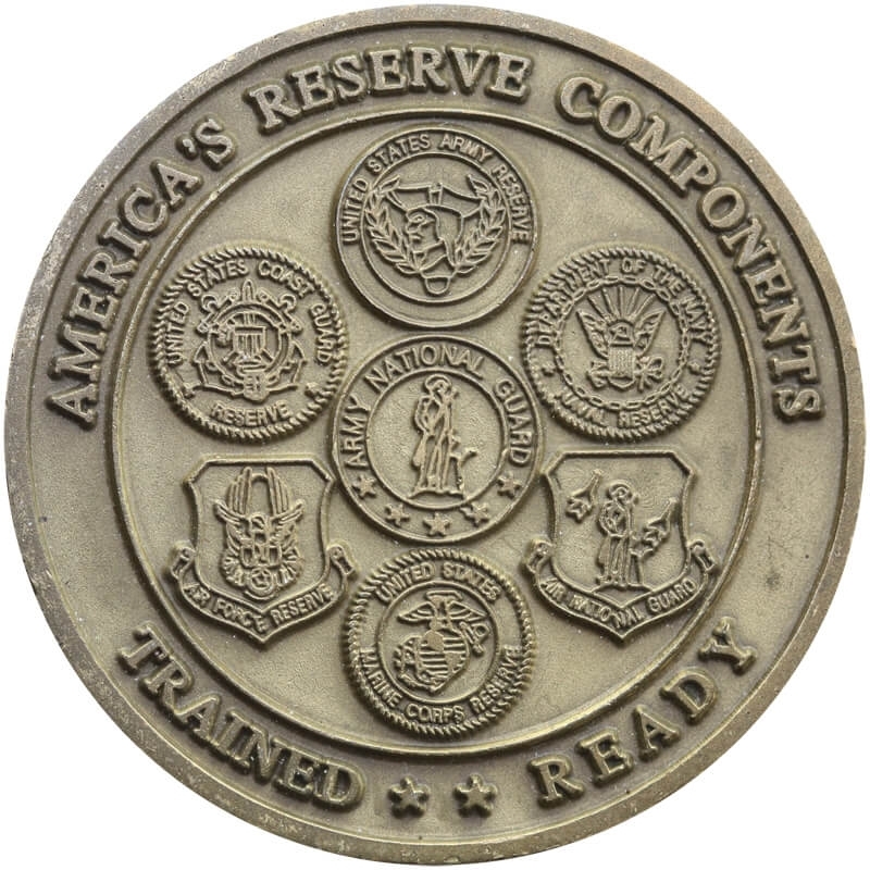 Przedstawia zespół siedmiu emblematów wszystkich komponentów rezerwowych Sił Zbrojnych USA: Army National Guard (centrum), Army Reserve, Coast Guard Reserve, Naval Reserve, Air Force Reserve, Marine Corps Reserve oraz Air National Guard. W otoku górnym napis: AMERICA’S RESERVE COMPONENTS. W dolnym motto: TRAINED ★ ★ READY.
