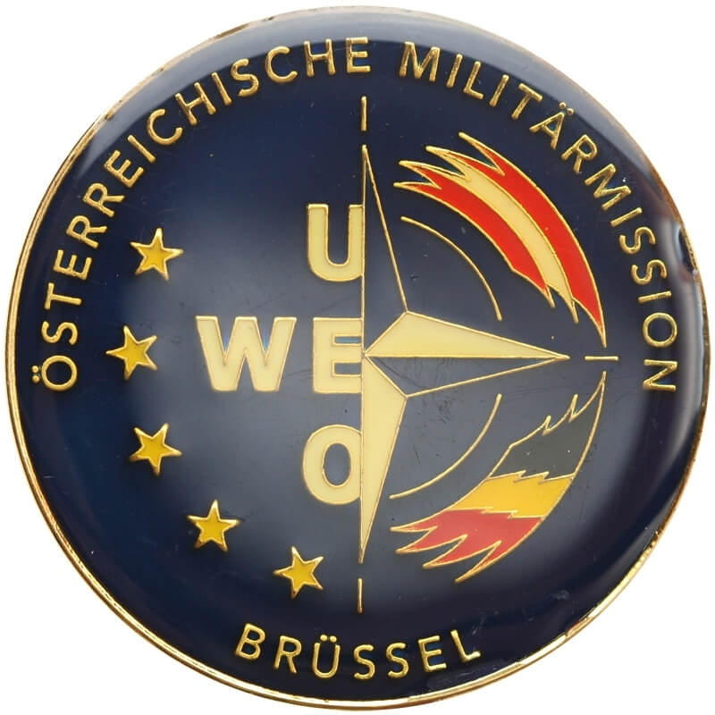 Na granatowym, emaliowanym tle złocone symbole organizacji międzynarodowych: flaga WEU/UEO oraz róża wiatrów NATO. Po lewej stronie pięć złotych gwiazd, po prawej stylizowane barwy narodowe Austrii oraz flagi państw sojuszniczych. W otoku napis: ÖSTERREICHISCHE MILITÄRMISSION oraz lokalizacja: BRÜSSEL.