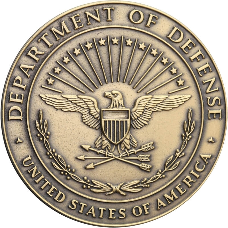 Oficjalna pieczęć Departamentu Obrony USA (Department of Defense) przedstawiająca orła z tarczą na piersi, trzymającego trzy strzały, na tle promieni słonecznych i 13 gwiazd. W otoku napis: DEPARTMENT OF DEFENSE · UNITED STATES OF AMERICA.