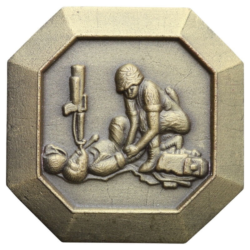 Dynamiczny i pełen detali relief 3D przedstawiający ratownika medycznego (Combat Medic) udzielającego pomocy rannemu żołnierzowi. Obok widoczny „Battlefield Cross” (karabin wbity w ziemię z hełmem), symbolizujący poświęcenie i pamięć o poległych.