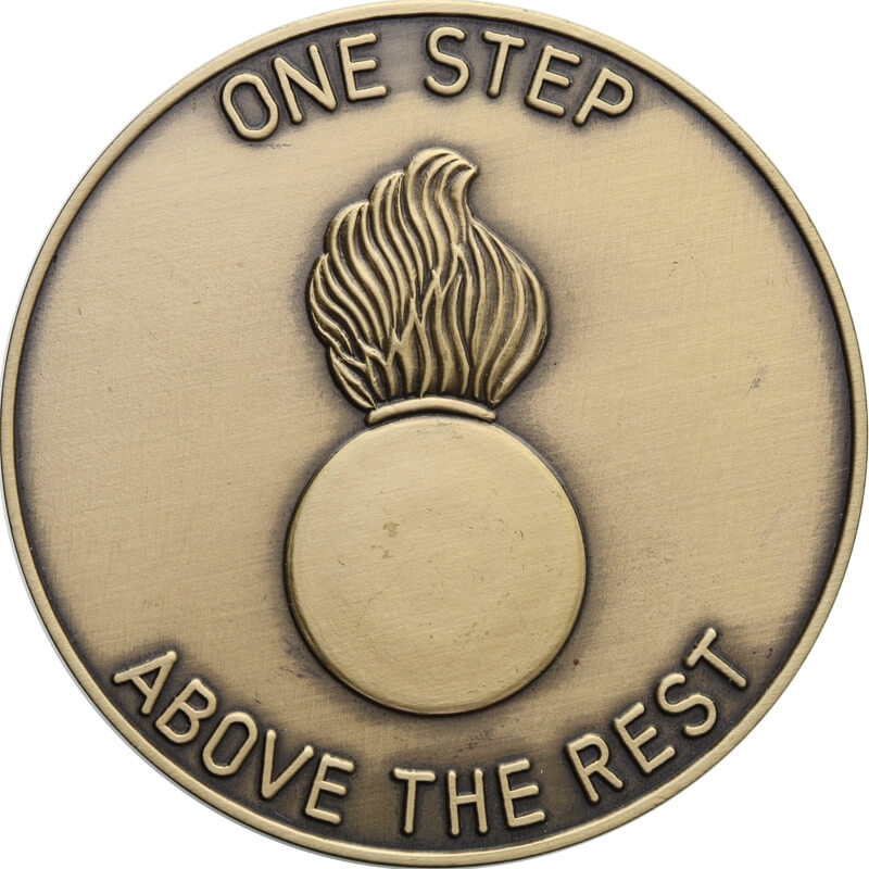 Duży symbol płonącego granatu (klasyczny symbol US Army Ordnance Corps). W otoku bojowe hasło jednostki: ONE STEP ABOVE THE REST.