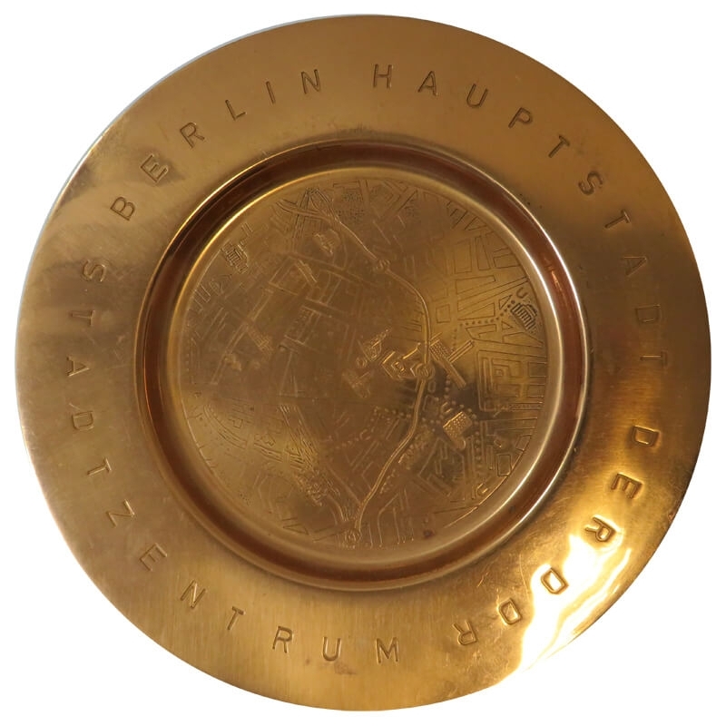 Oryginalny miedziany talerz z czasów NRD, dekorowany planem centrum Berlina i napisem „Hauptstadt der DDR”. Egzemplarz bez zawieszki, zachowany w dobrym stanie użytkowym. Kolekcjonerska pamiątka epoki, idealna dla miłośników historii Berlina i ostalgii.