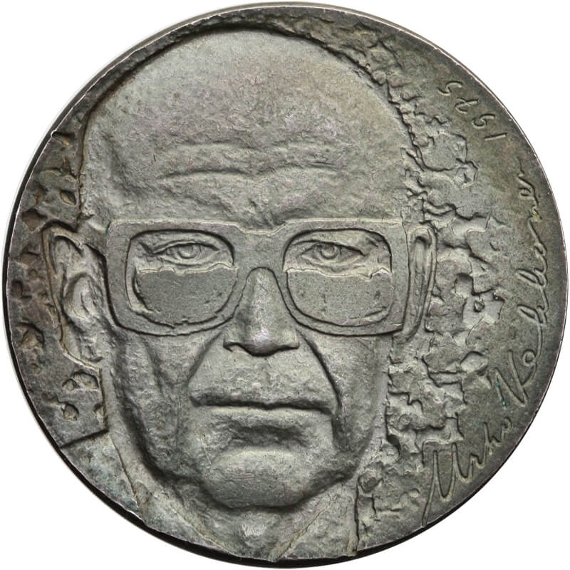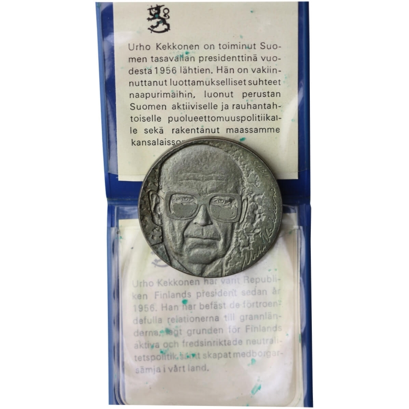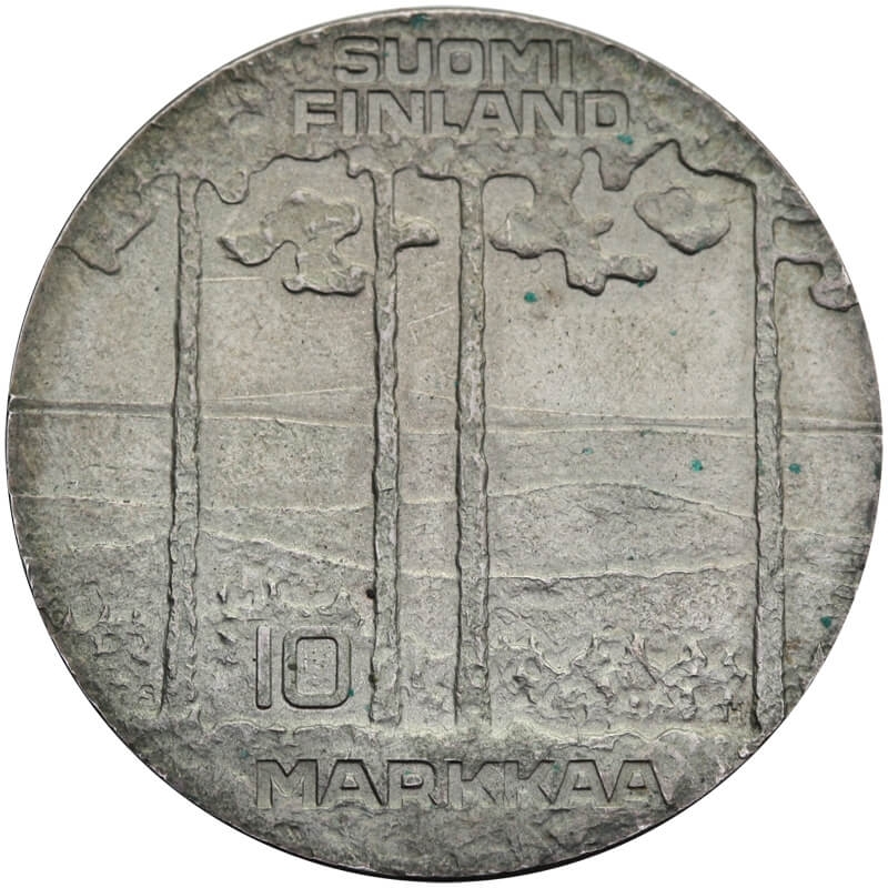 Fińska moneta okolicznościowa o nominale 10 marek z 1975 roku, wybita na cześć prezydenta Urho Kekkonena. Awers przedstawia portret przywódcy z podpisem i datą, rewers ukazuje stylizowany pejzaż z drzewami oraz nominał 10 Markkaa.