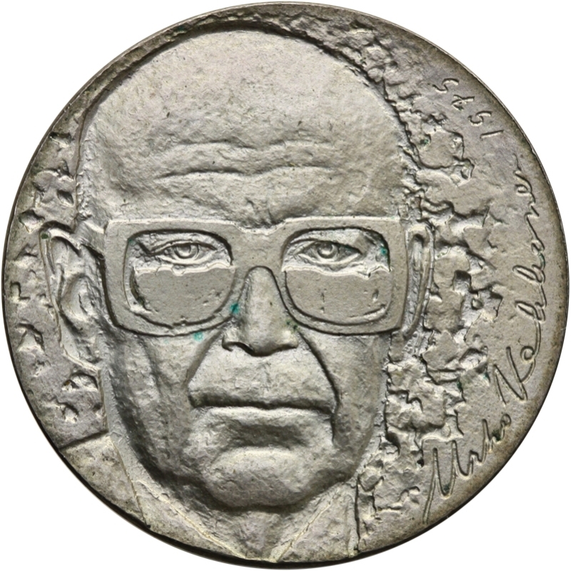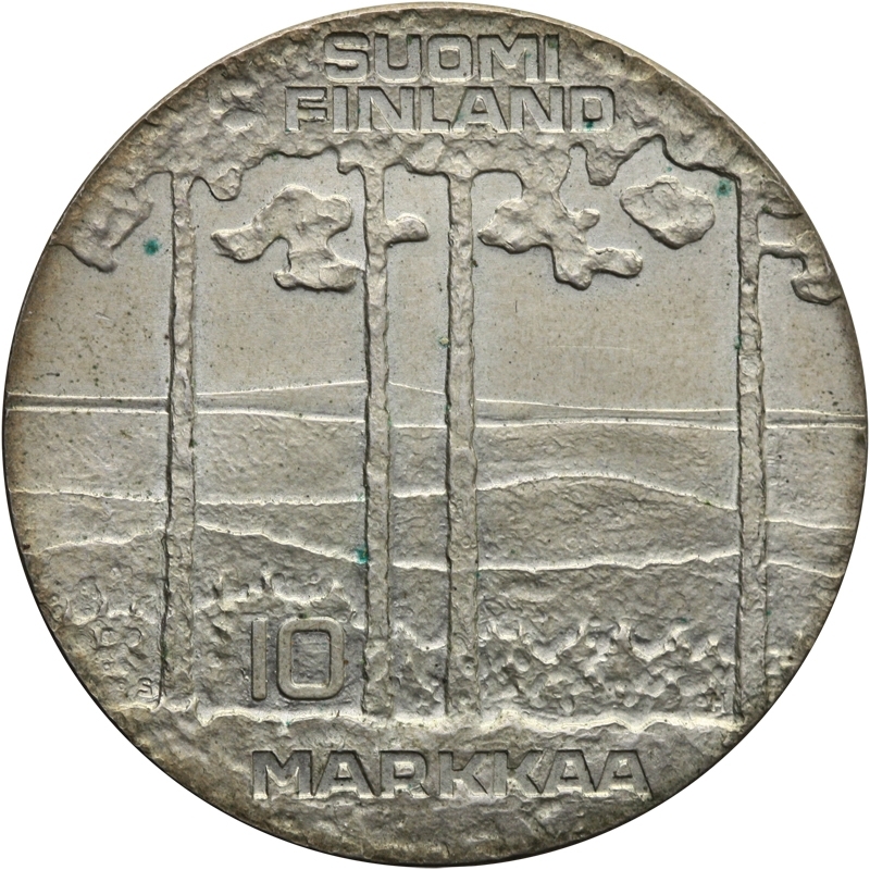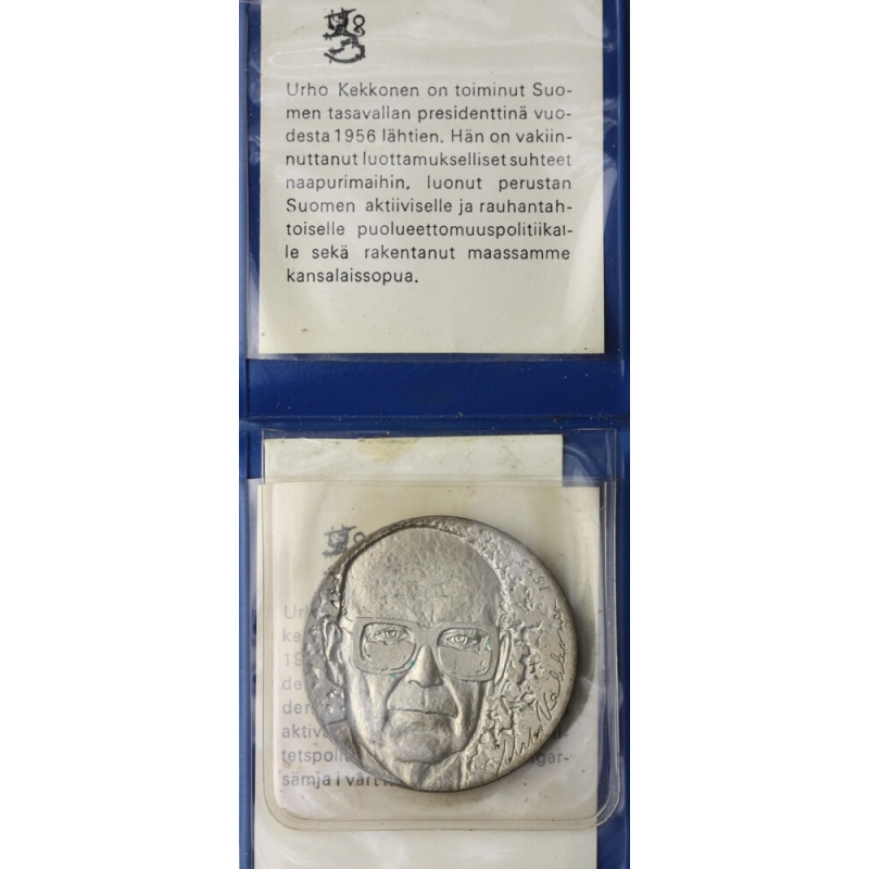 Fińska moneta okolicznościowa o nominale 10 marek z 1975 roku, wybita na cześć prezydenta Urho Kekkonena. Awers przedstawia portret przywódcy z podpisem i datą, rewers ukazuje stylizowany pejzaż z drzewami oraz nominał 10 Markkaa.