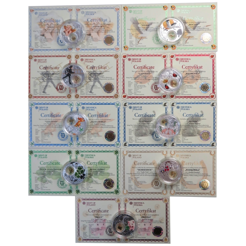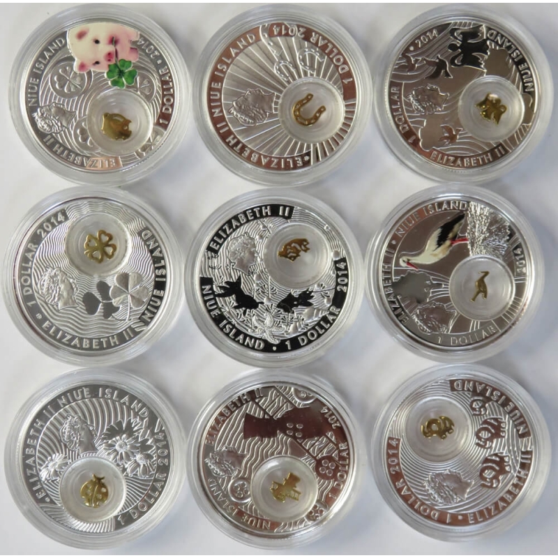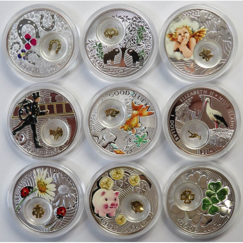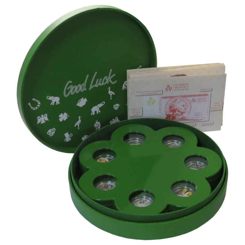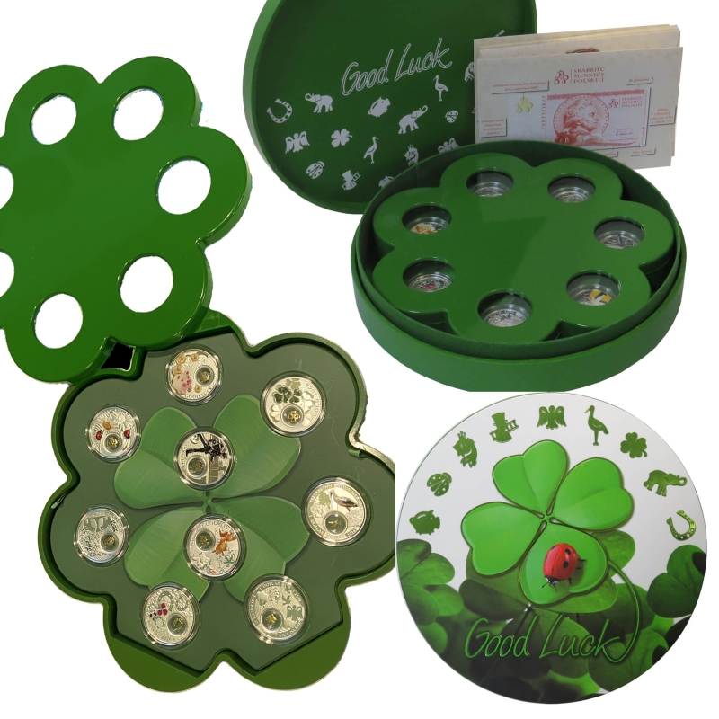 Kolekcjonerski zestaw srebrnych monet „Good Luck” poświęcony motywom szczęścia i pomyślności. Emisja wydana dla Niue Island w 2014 roku, wybita ze srebra próby Ag 999 w jakości kolekcjonerskiej, z dekoracyjnymi elementami pozłacanymi oraz kolorowanymi.