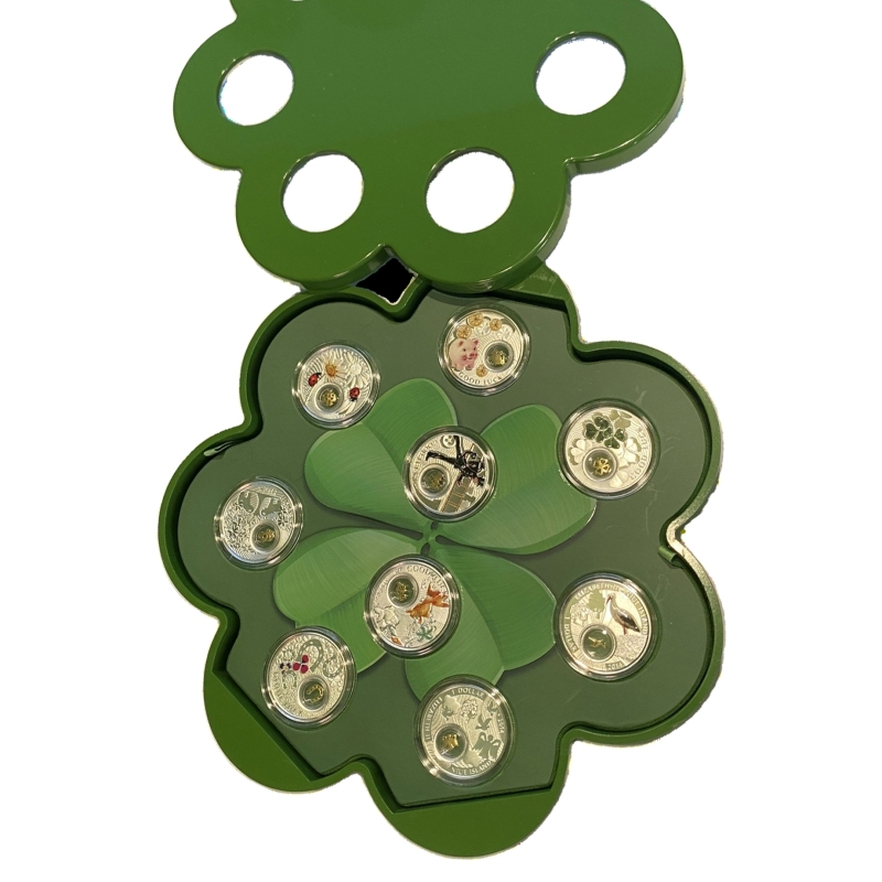 Zestaw składa się z 9 monet o nominale 1 Dollar, z których każda przedstawia inny symbol szczęścia, m.in. czterolistną koniczynę, podkowę, biedronkę, słonia, anioła, bociana czy świnkę. W centralnej części każdej monety umieszczony jest drobny, złocony motyw-symbol, nadający emisji charakter ozdobny i prezentowy.