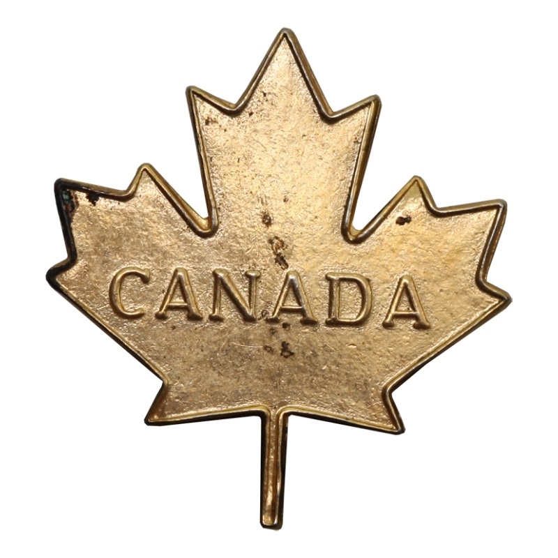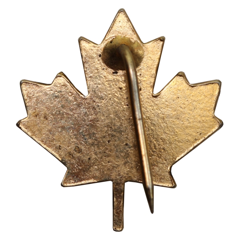 Mosiężna lub złocona wpinka patriotyczna/pamiątkowa w kształcie charakterystycznego liścia klonu, będącego narodowym symbolem Kanady.