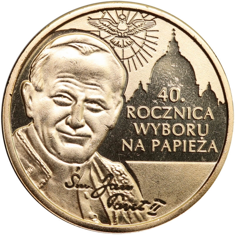 Awers: Centralną część zajmuje radosny portret Jana Pawła II. Po prawej stronie widnieje sylwetka Bazyliki św. Piotra w Watykanie, nad którą unosi się gołębica symbolizująca Ducha Świętego. Poniżej znajduje się napis: "40. ROCZNICA WYBORU NA PAPIEŻA" oraz faksymile podpisu Sancti Ioannis Pauli II.