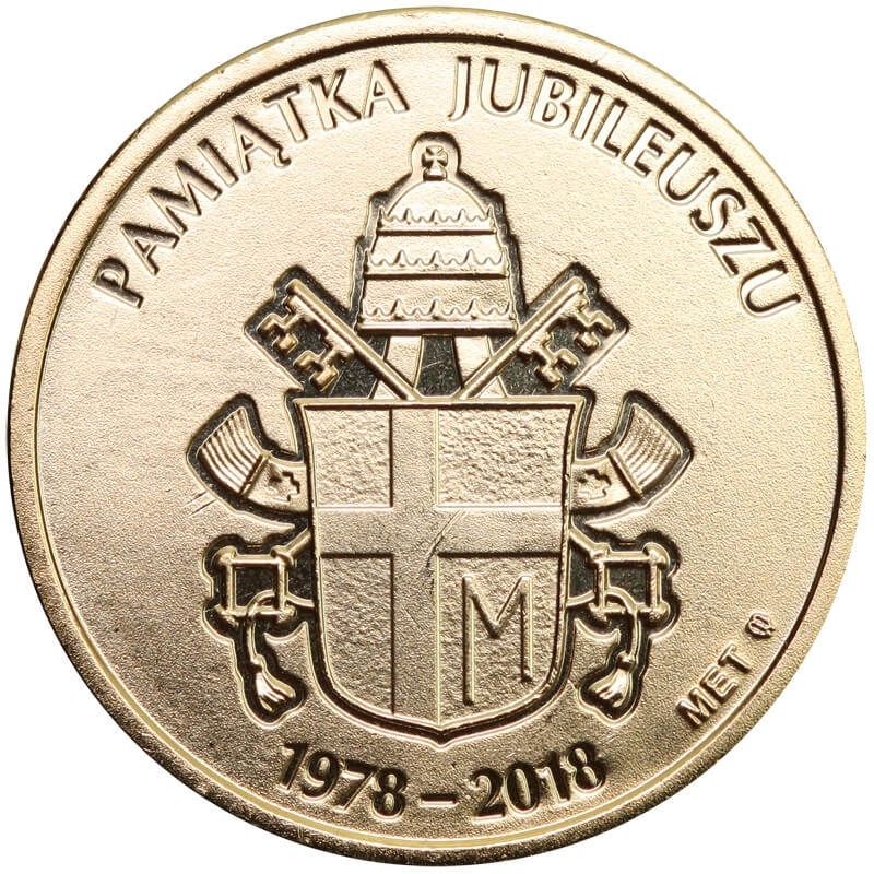 Rewers: Przedstawia oficjalny herb papieski Jana Pawła II (krzyż i litera "M" symbolizująca Maryję), zwieńczony tiarą i kluczami św. Piotra. W otoku napis: "PAMIĄTKA JUBILEUSZU". U dołu daty 1978–2018. Przy krawędzi widoczna sygnatura MET z oznaczeniem menniczym.