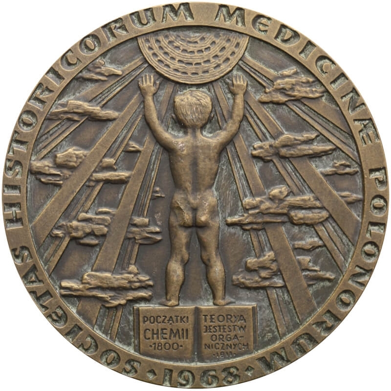 Alegoryczna scena: postać dziecka stojącego tyłem, z uniesionymi rękami ku symbolicznie przedstawionemu słońcu, z którego rozchodzą się promienie. W tle chmury. U dołu napis: POCZĄTKI TEORII CHEMII – 1800 –. W otoku napis: HISTORIA NAUK MEDYCZNYCH W POLSCE – 1968.