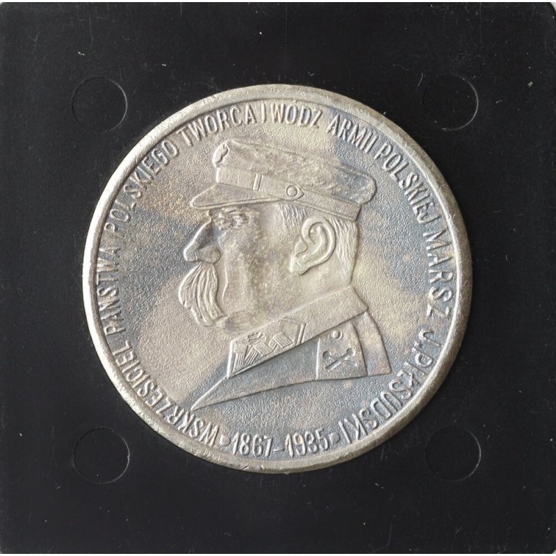 Awers: W centrum medalu profilowa głowa Józef Piłsudski w mundurze i czapce, w otoku napis: „TWÓRCA I WÓDZ ARMII POLSKIEJ MARSZ. J. PIŁSUDSKI • 1867-1935”.