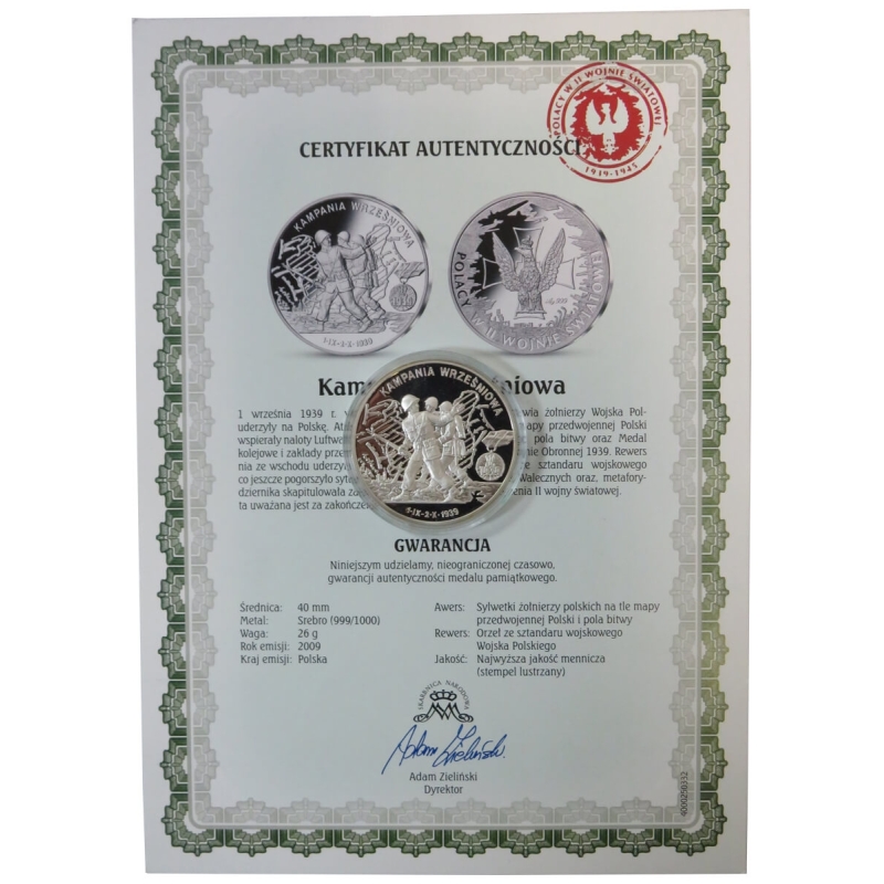 Medal ze zdjęcia upamiętniający kampanię wrześniową 1939 roku. Wykonany z najwyższej próby srebra 999. Wspaniała pamiątka.