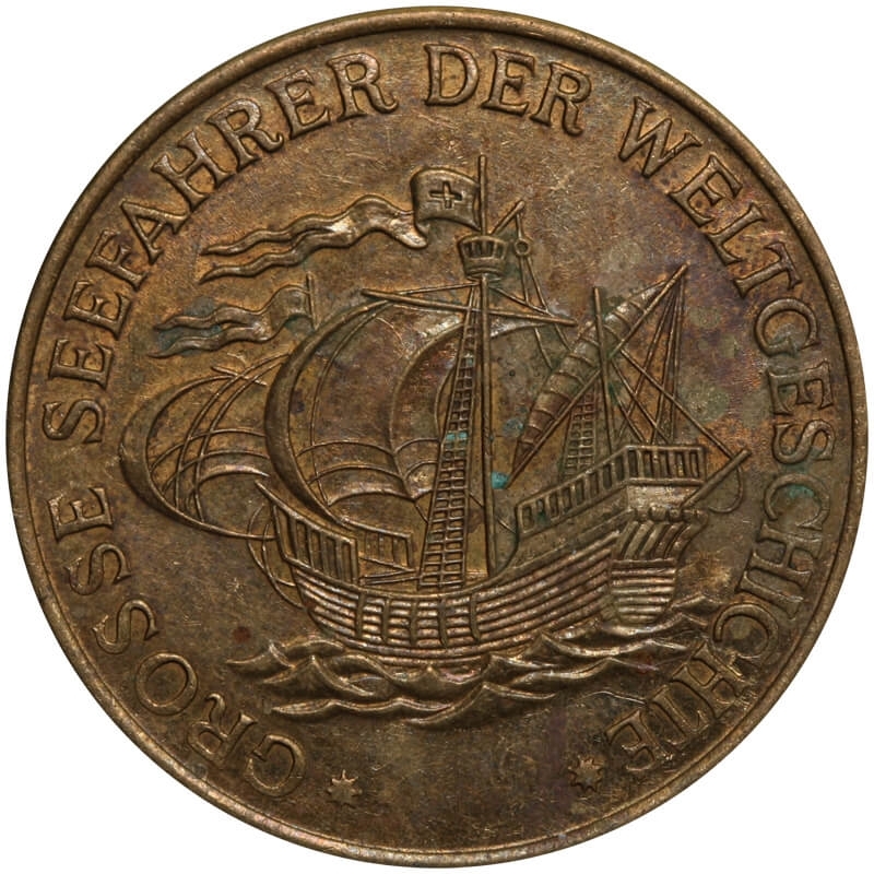 Rewers: żaglowiec oraz napis „Große Seefahrer der Weltgeschichte” (Wielcy żeglarze historii świata).