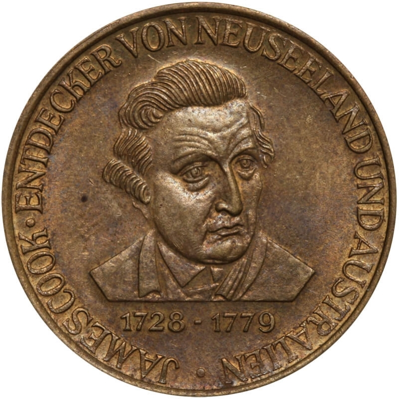 Awers: popiersie Jamesa Cooka i daty „1728–1779” z napisem „James Cook Entdecker von Neuseeland und Australien”.