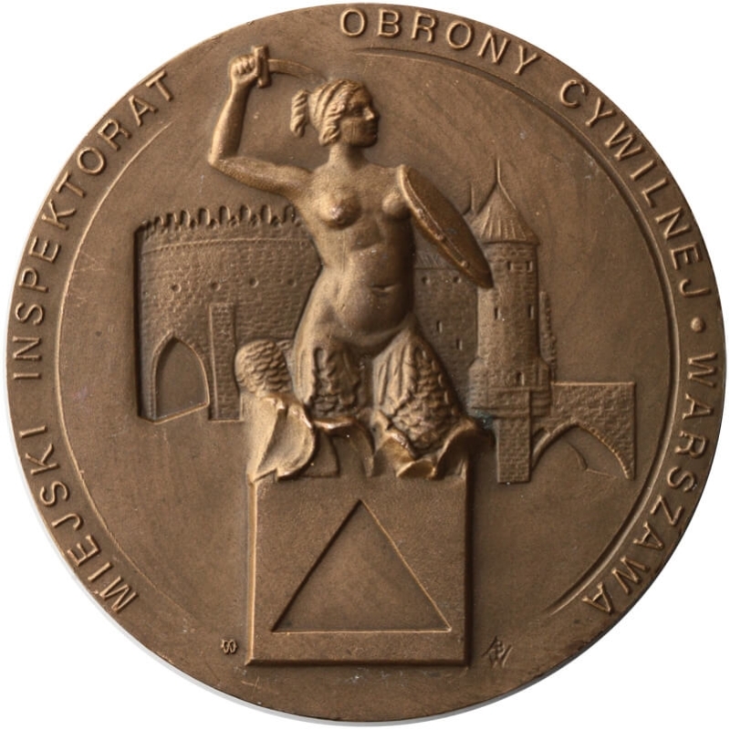 Na awersie przedstawiono alegoryczną postać kobiecą symbolizującą obronę miasta, uzbrojoną w miecz i tarczę. W tle widoczne są elementy architektury miejskiej nawiązujące do murów obronnych Warszawy. U dołu umieszczono znak Obrony Cywilnej (trójkąt w kwadracie). W otoku napis: MIEJSKI INSPEKTORAT OBRONY CYWILNEJ WARSZAWA.