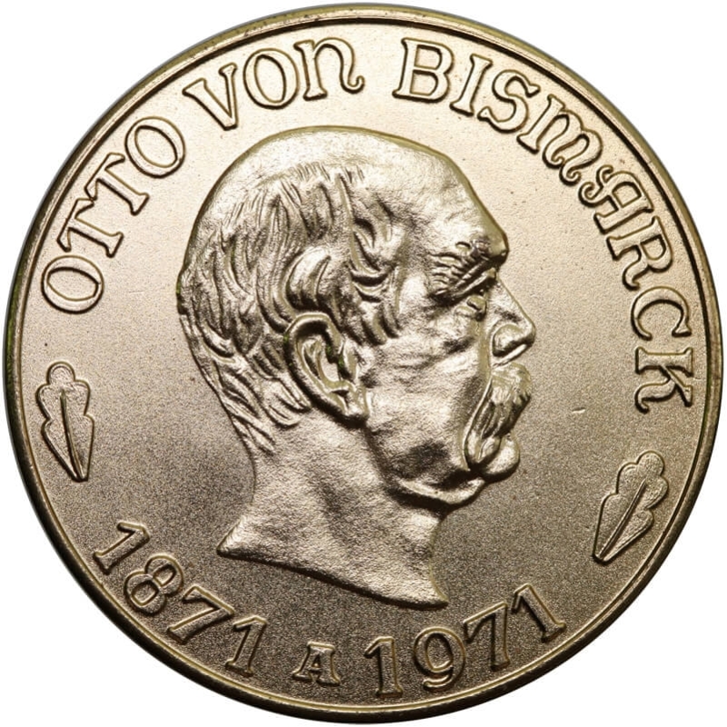 Popiersie Otto von Bismarcka w profilu. W otoku napis: „OTTO von BISMARCK”, u dołu daty: „1871–1971”.