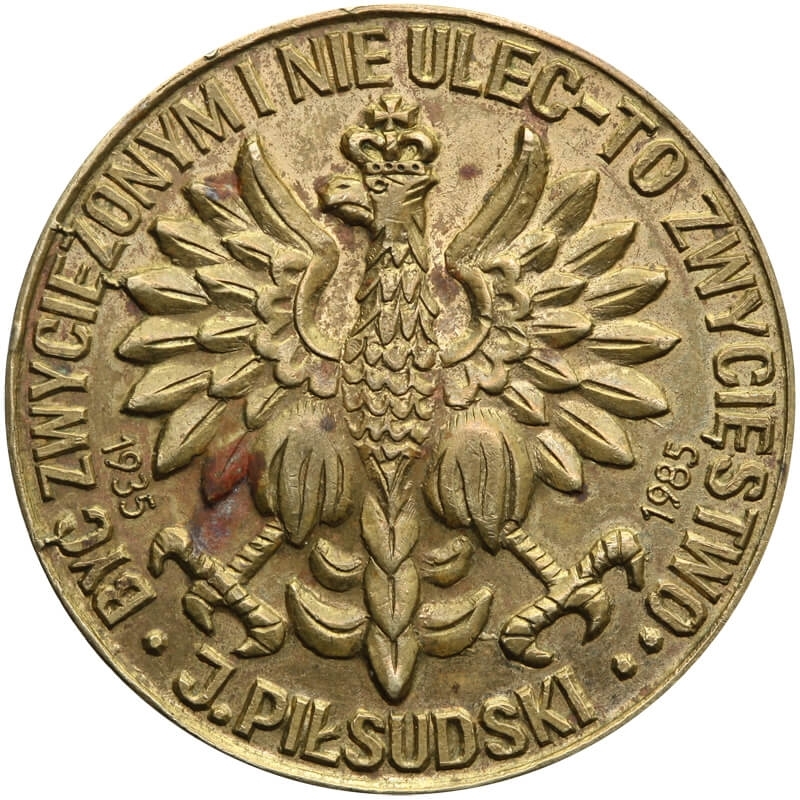 Rewers ukazuje stylizowanego orła państwowego w koronie. W otoku umieszczono napis „BYĆ ZWYCIĘŻONYM I NIE ULEC TO ZWYCIĘSTWO”, będący znanym mottem przypisywanym Józefowi Piłsudskiemu, oraz daty 1935–1985.