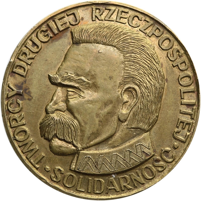 Awers przedstawia profilowy portret Józefa Piłsudskiego z charakterystycznym wąsem. W otoku widnieje napis „TWÓRCY DRUGIEJ RZECZPOSPOLITEJ • SOLIDARNOŚĆ”, nawiązujący do idei niepodległościowych oraz tradycji ruchu społecznego lat 80.