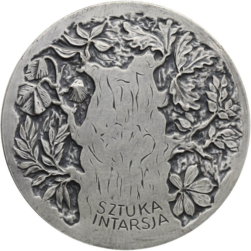 Sylweta mapy Polski otoczona motywami roślinnymi. U dołu napis: „SZTUKA INTARSJA”.