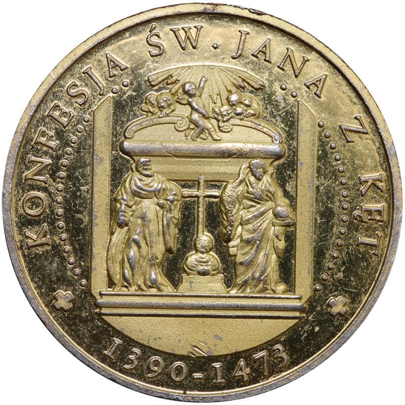 Przedstawienie „Konfesja św. Jana z Kęt”. W otoku napis: „KONFESJA ŚW. JANA Z KĘT”, u dołu daty: „1390–1473”.