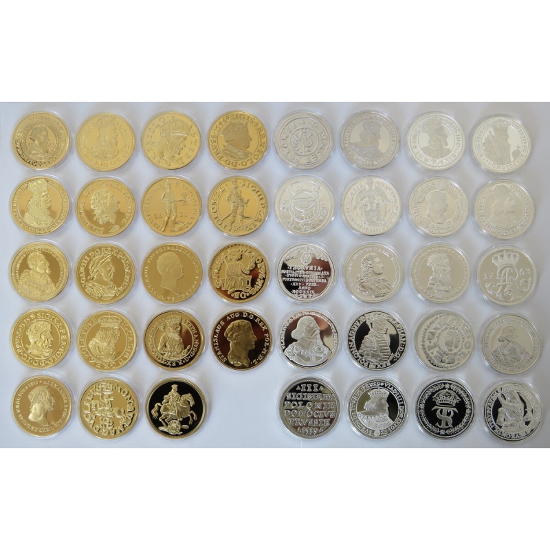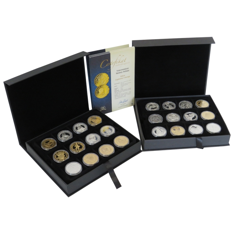 Wyjątkowy zbiór najważniejszych i najrzadszych monet w historii Polski, odwzorowany w formie pozłacanych i posrebrzanych replik. Zestaw zawiera 39 sztuk o wysokiej jakości wykonania, przedstawiających m.in. dukaty, talary i denary władców Polski od średniowiecza po czasy nowożytne.