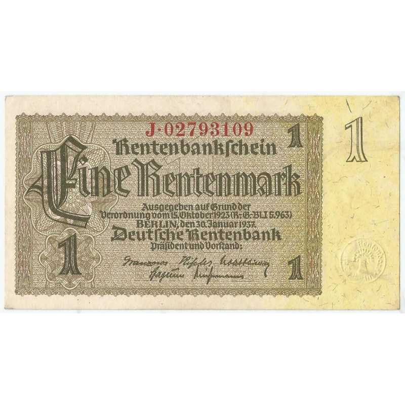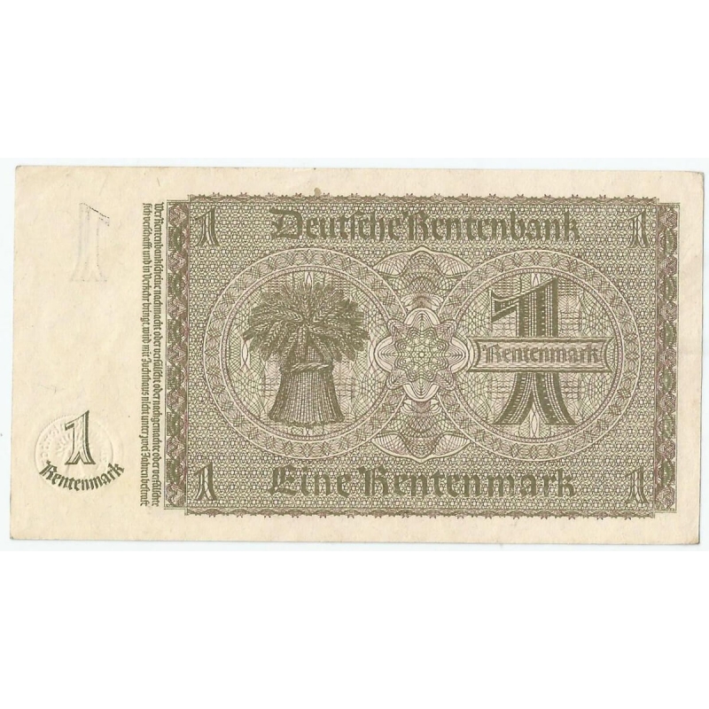 Na awersie widoczna gotycka inskrypcja „Eine Rentenmark” oraz liczne gilosze charakterystyczne dla tej serii. Rewers przedstawia snop zboża – symbol reformy walutowej po roku 1923 – oraz rozbudowany ornament geometryczny. Banknot z czerwonym numerem serii i suchym tłoczeniem Rentenbanku. Egzemplarz w pięknym stanie zachowania, praktycznie bez śladów obiegu.