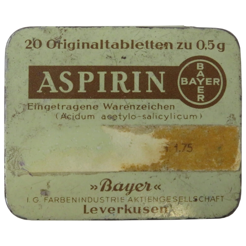 Oryginalna, metalowa puszka po leku Aspirin produkcji firmy Bayer, pochodząca z okresu przedwojennego. Egzemplarz sygnowany nazwą I.G. Farbenindustrie Aktiengesellschaft, Leverkusen, co pozwala datować puszkę na lata przed II wojną światową.