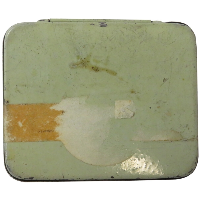 Puszka wykonana z blachy, malowana na jasnozielony kolor. Zachowana w stanie autentycznym, z wyraźnymi śladami użytkowania i upływu czasu: przetarcia farby, rysy, drobne ogniska korozji oraz pozostałości po papierowej etykiecie na odwrocie. Zawias i kształt puszki zachowane, bez ingerencji konserwatorskich.