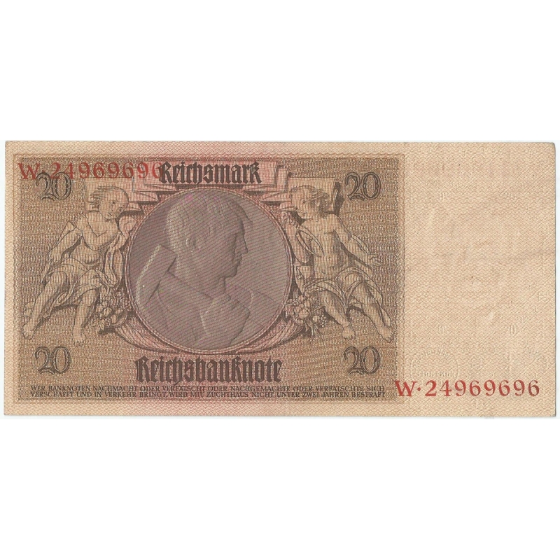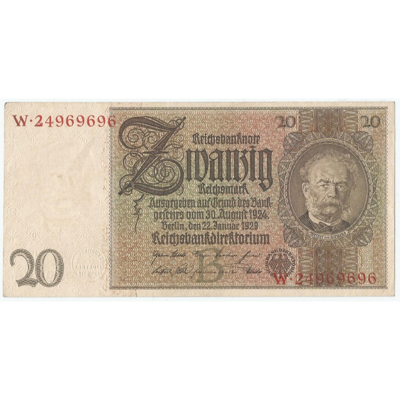 Banknot o nominale 20 Reichsmark emitowany przez Reichsbank, z datą 22 stycznia 1929. Na awersie widoczny portret Wernera von Siemensa, niemieckiego wynalazcy i przemysłowca. Numeracja W 24969696 – ciekawy, pół-symetryczny układ cyfr, ceniony kolekcjonersko. Druk w charakterystycznej, wyszukanej ornamentyce późnego okresu Republiki Weimarskiej.