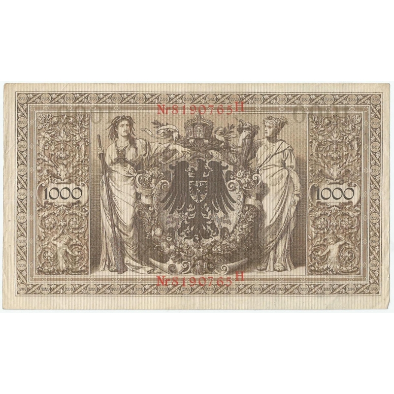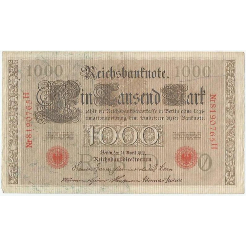 Banknot ze zdjęcia. Awers banknotu zdobi duży gotycki napis „Ein Tausend Mark”, ozdobne gilosze oraz wartość „1000” w centralnej ramce. Czerwone pieczęcie i numeracja podkreślają autentyczność. Rewers ukazuje cesarski herb Niemiec otoczony ornamentyką i postaciami alegorycznymi — typowy dla wielkich nominałów Cesarstwa Niemieckiego. Banknot datowany na 21 kwietnia 1910, emisja Reichsbank Berlin.