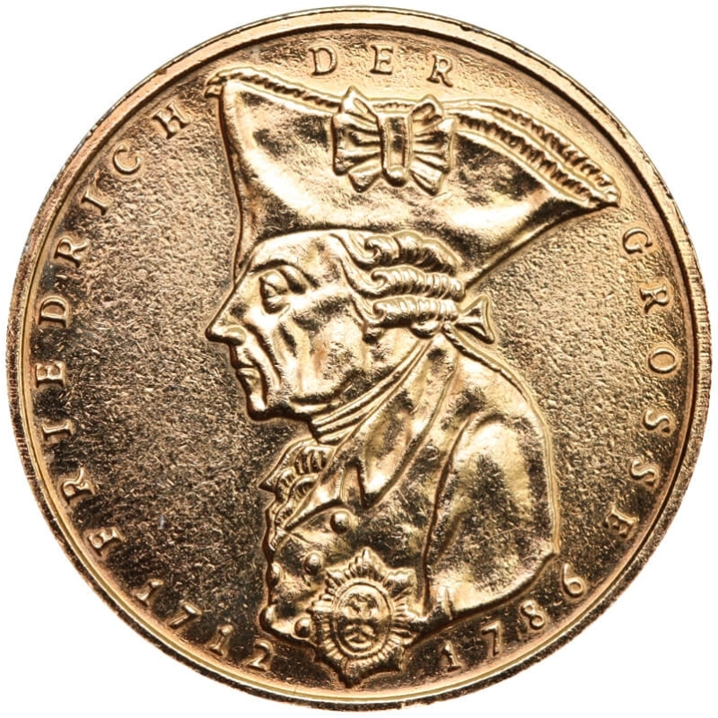 Okolicznościowa moneta o nominale 5 marek niemieckich (DM), wybita w 1986 roku dla upamiętnienia 200. rocznicy śmierci króla Prus, Fryderyka II Wielkiego. Prezentowany egzemplarz charakteryzuje się efektownym, wtórnym złoceniem, które nadaje mu unikalny, luksusowy wygląd, podkreślając detale portretu „Starego Fryca”.
