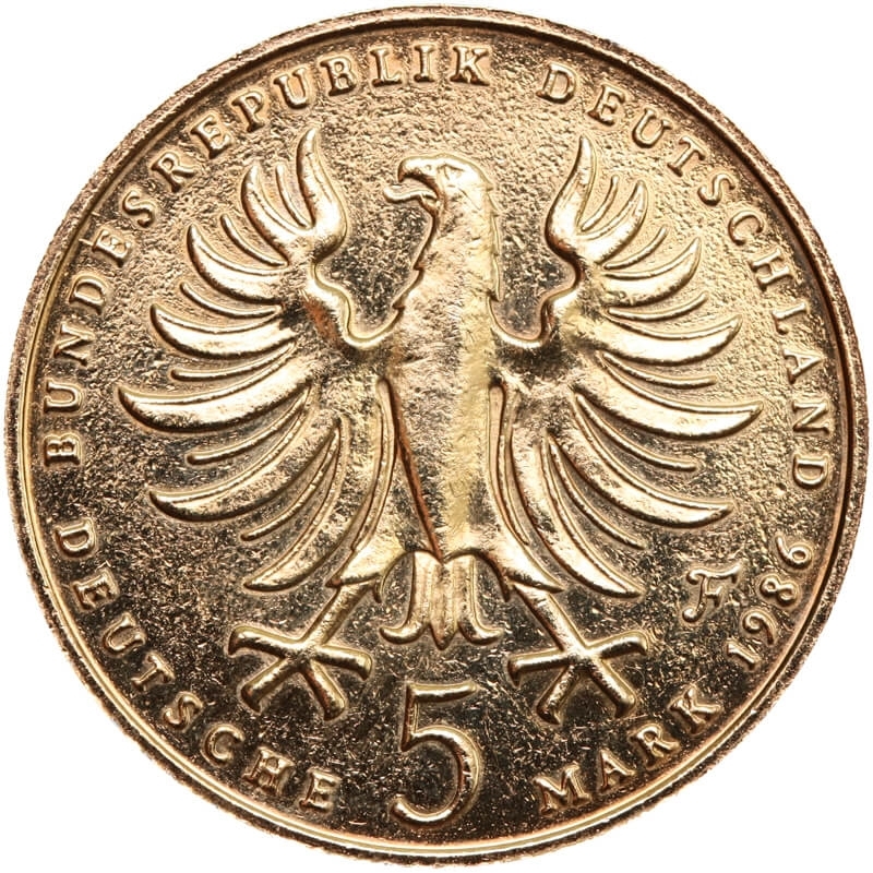 Awers: Nowoczesne ujęcie orła federalnego, pod nim nominał 5 MARK, rok 1986 oraz znak mennicy F. W otoku napis: BUNDESREPUBLIK DEUTSCHLAND.
