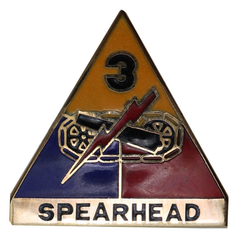 Oryginalna amerykańska odznaka korpusu (DUI – Distinctive Unit Insignia) słynnej 3 Dywizji Pancernej (3rd Armored Division), znanej pod legendarnym przydomkiem „Spearhead” (Grot).