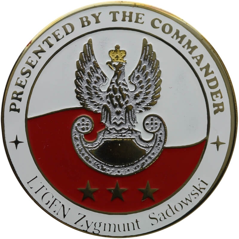 Znaczenie historyczne: Monety personalne (opatrzone nazwiskiem) są najbardziej prestiżową kategorią challenge coins. Generał broni Zygmunt Sadowski był postacią historyczną – pierwszym Polakiem na stanowisku dowódcy Korpusu NATO. Przedmiot ten nie był dostępny w oficjalnym obrocie; jest to egzemplarz „z pierwszej ręki”, przekazany jednemu generałowi przez drugiego, co nadaje mu najwyższą rangę kolekcjonerską. Jest to walor o charakterze ściśle elitarnym, nienotowany w katalogach numizmatycznych i praktycznie niedostępny na rynku kolekcjonerskim. Łączy w sobie historię NATO, polskiej obecności w strukturach dowódczych Sojuszu oraz osobisty wymiar służby jednego z kluczowych polskich generałów.